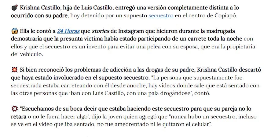 La hija de Luis Castillo, Krishna Castillo, negó que el presunto secuestro en el que estaría involucrado fuera real. "Nunca hubo un secuestro", aseguró, apuntando a que el supuesto secuestrado temía que su pareja "lo retara".www.biobiochile.cl