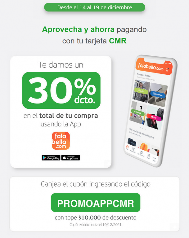 me tira error de servidorCupón de 30% de descuento (tope 10.000) en Falabella.com pagando con CMR en la app PROMOAPPCMR