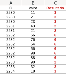 Hola a todos, alguien si me puede dar una mano... como podría obtener la columna "C" ?? , tengo una columna "A", donde tengo varios ID y cada ID puede tener mas de un valor, pero necesito contar cuantos valores tiene cada ID. Por ejemplo en ID "2230" tiene 3 valores, el ID "2232" tiene 6 valores y asi...
