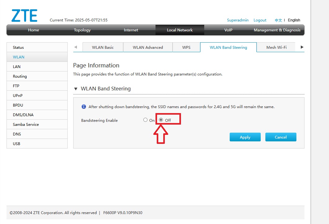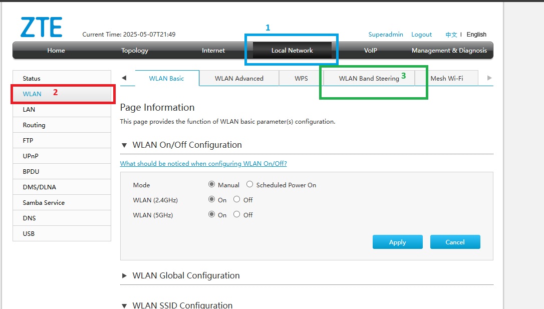 update 2: le encontré la maña a la ONT, pude separar bandas y cambiar nombre y todo. Primero deben reiniciar la ONT conectada al ethernet, luego al reiniciar ingresar automáticamente al 192.168.1.1 e ingresar con las credenciales que están arriba, después ir directo a la sección de WLAN en local networks y pueden hacer sus cambios totalmente con toda libertad, luego de ese primer inicio, se bloquean; o lo otro seria modificar el html pero eso ya es para expertos xD