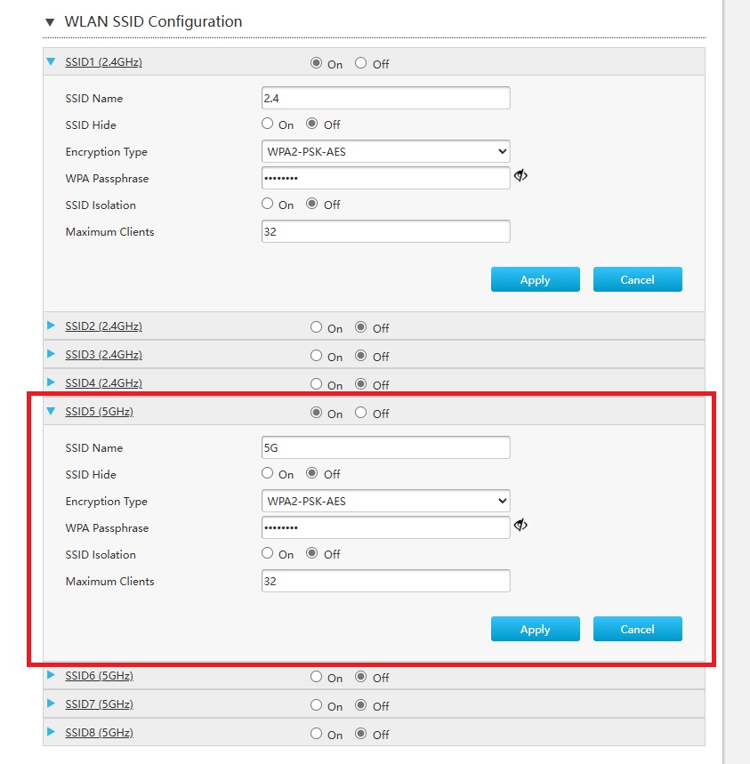 pero las opciones de WLAN están todas bloqueadas, no se pueden separar bandas, ni cambiar nombres, me aparecen activas 2 redes mas, la SSID 2 y SSID 6