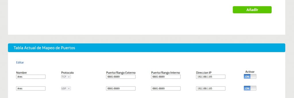 Desbloqueo de puertos para Ares fibra