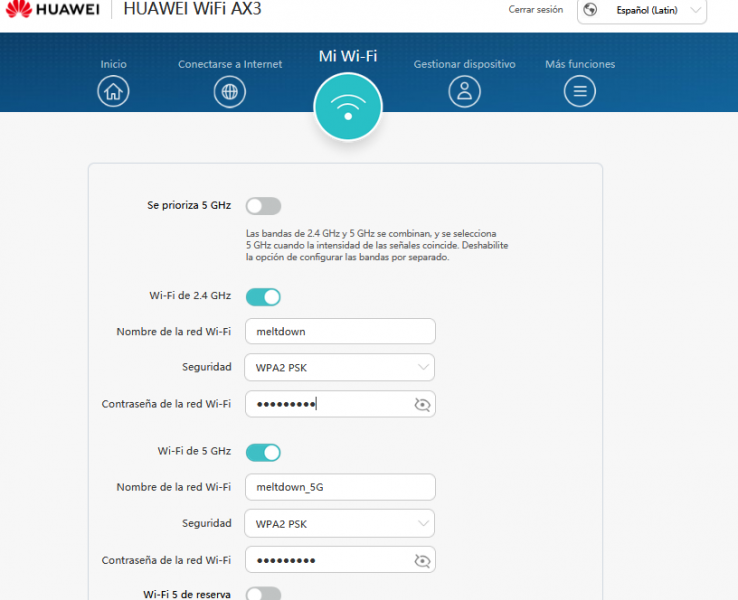 Ahora, en el apartado de configuracion de Wifi, el router nos dará la opcion de "Priorizar 5G" esto significa que las redes tanto en 2.4 Ghz como en 5 GHz usan el mismo nombre o BSSID, ideal para centrar un unico nombre, pero para las pruebas decidí dejarlas separadas, además les cambie el nombre a las redes: