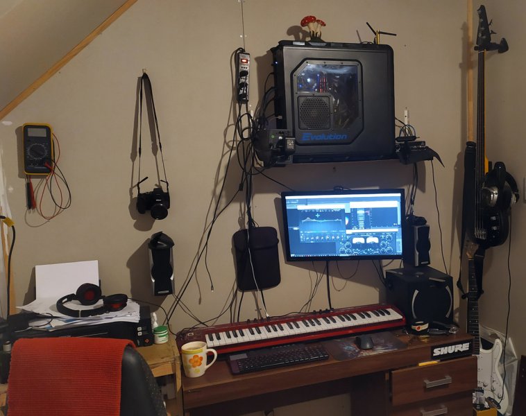 Mandé a hacer este mueble. Aún no me llega, mide 2.05 mts, la idea es que tanto mi mujer y yo podamos realizar trabajo remoto, en su caso en el equipo de operaciones de su empresa y yo, mis clases online. Yo ubicaría el gabinete arriba, compraré un soporte para el monitor para ganar algo de espacio e instalar micrófono (me conecto vía droid y es algo incómodo) mientras que ella usa note y pantalla de 24 pulgadas. Al medio, la impresora, mientras que el parlante con las hueás chicas en una repisa. Compré ya las sillas, las más baratas que encontré, las lucas andan justas en estos tiempos.