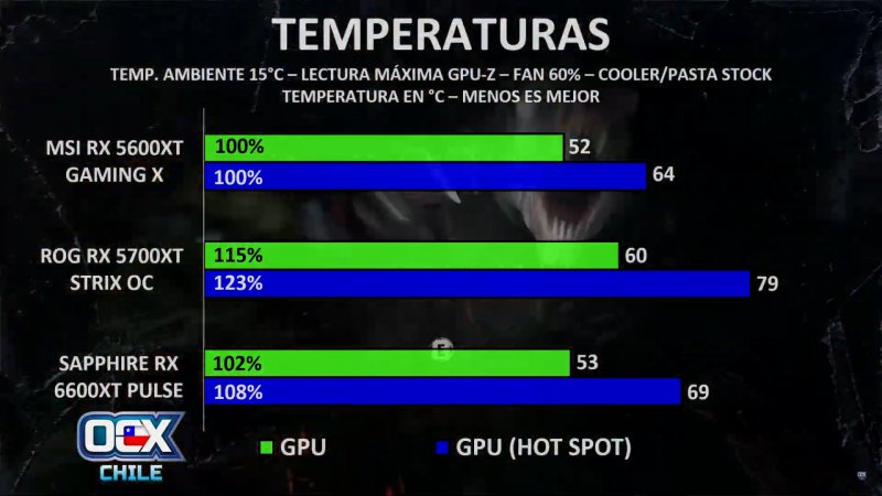 Mantuvimos un registro de las temperaturas más altas durante las pruebas. Para todos los modelos del gráfico se usó un valor fijo del 60% en los ventiladores y la temperatura ambiente fue de 15°C aproximados. Es destacable el resultado obtenido por el modelo Pulse, ya que se aproxima bastante a la solución Gaming X que es considerada de gama alta. En el caso de la 5700XT este ejemplar se mantuvo a una temperatura muy superior, sobre todo si vemos el sensor de GPU Hot Spot.