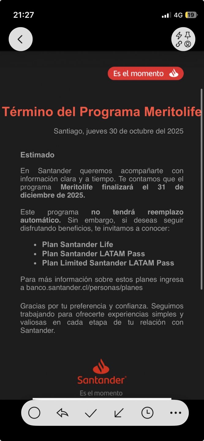 Para los que tengan productos Life como el plam Santander Life o Life LanPass, o la cuenta de ahorro Life, se acaba el programa MeritoLife el 31 de diciembre de 2025.